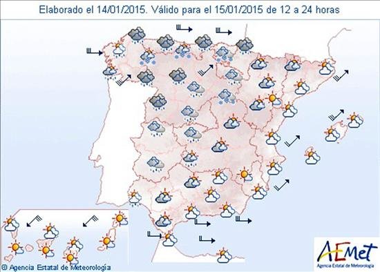 Mapa significativo elaborado por la Agencia Estatal de Meteorología (AEMET) el 14/01/2015 válido para el 15/01/2015 de 12 a 24 horas. EFE