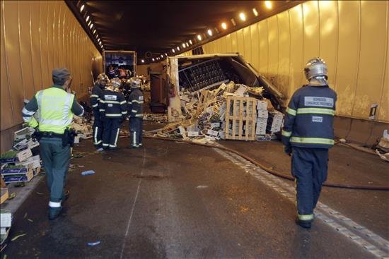 Unos bomberos trabajan en el túnel de acceso a Algeciras (Cádiz) donde esta mañana ha fallecido una persona en un accidente de tráfico cuando un camión de origen marroquí que transportaba fruta y verdura se salió de la vía, volcó e impactó