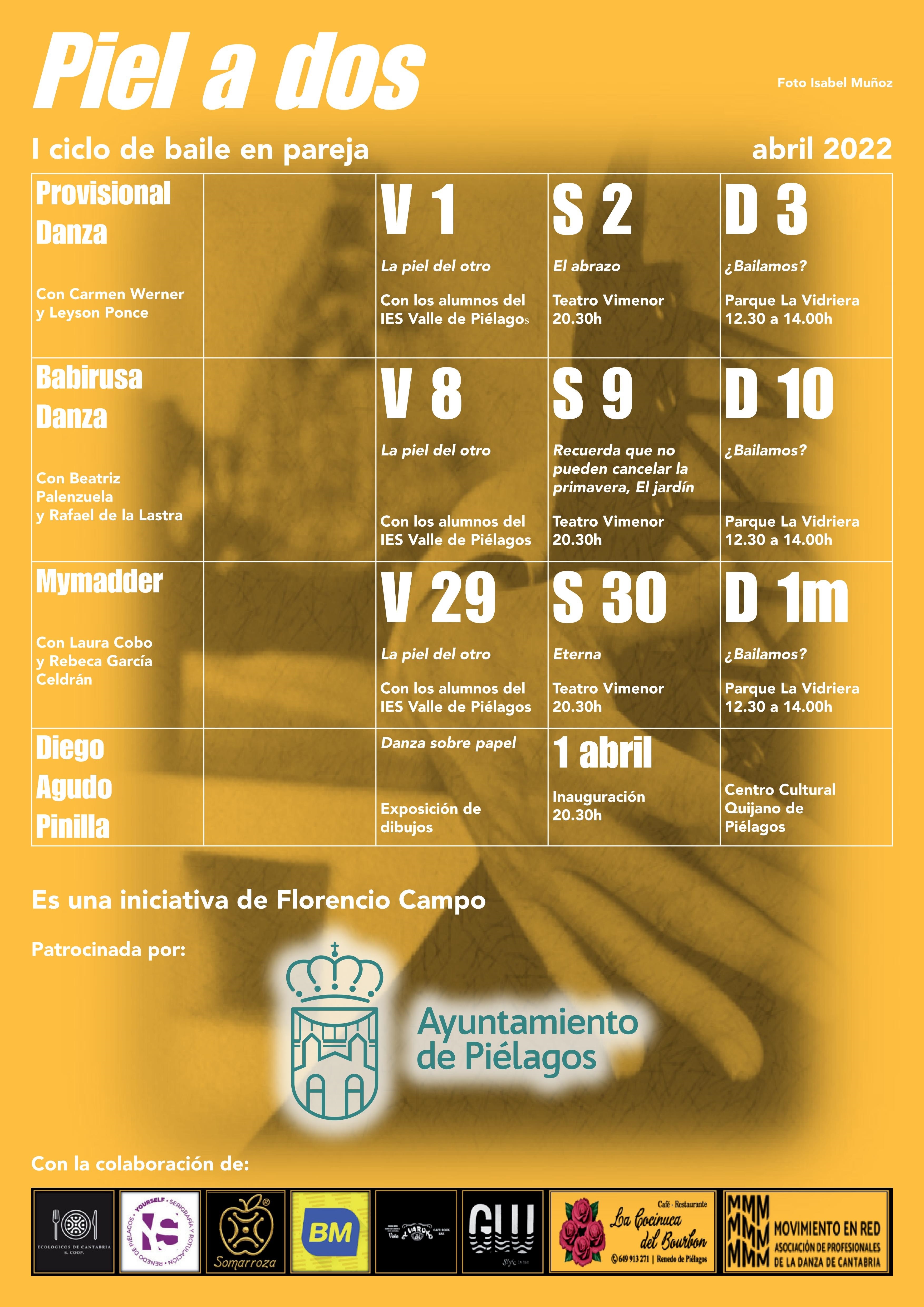 El municipio de Piélagos será durante el mes de abril la sede del nuevo ciclo de baile en pareja 'Piel a dos', una iniciativa ideada por el bailarín y coreógrafo Florencio Campo, organizada en colaboración con el Ayuntamiento, que incluirá propuestas en el IES Valle de Piélagos de Renedo, así como en el teatro y en el parque del Complejo municipal Vimenor de Vioño.