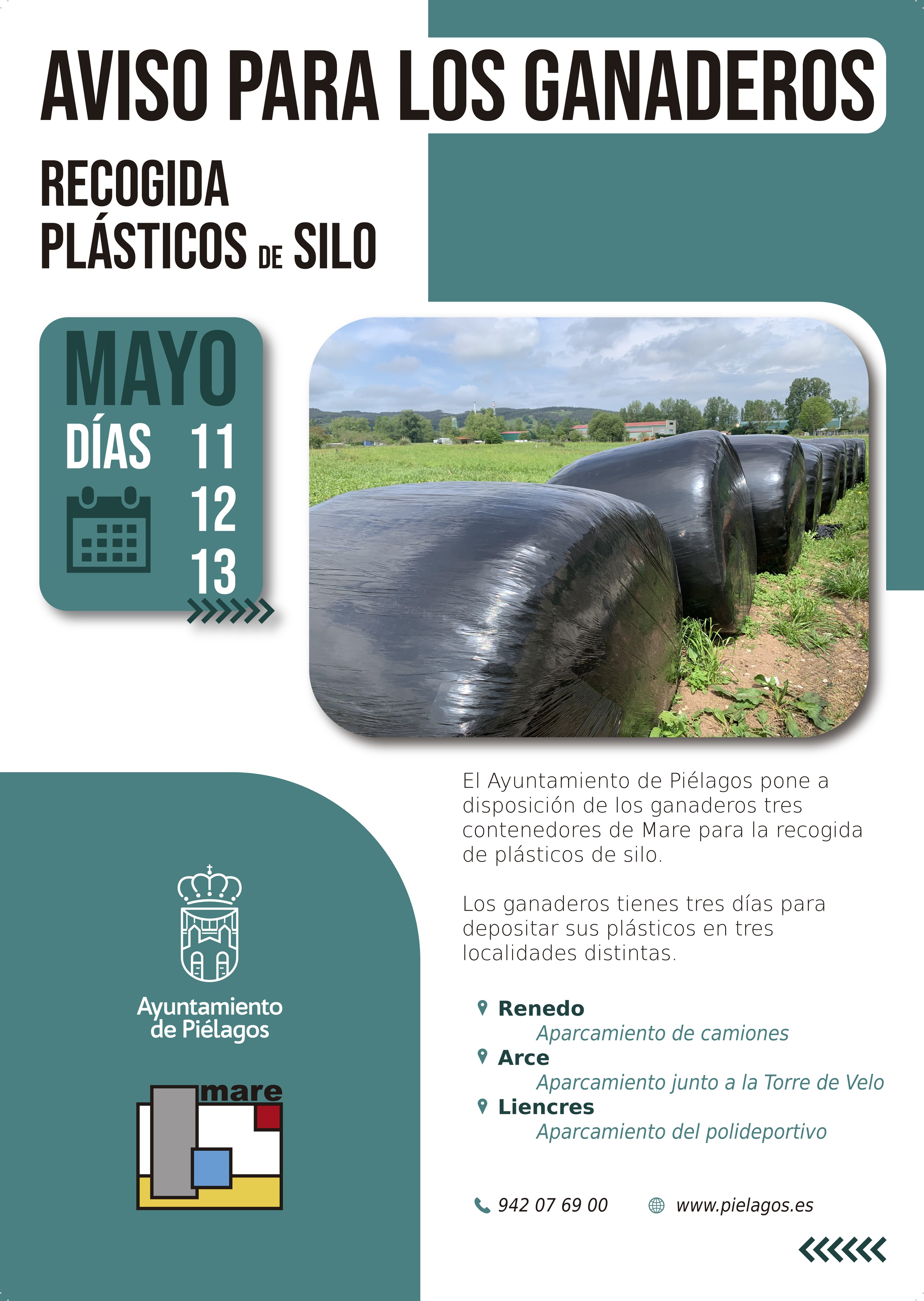 El Ayuntamiento de Piélagos, a través de las Concejalías de Ganadería y Medio Ambiente y en colaboración con la empresa pública Mare, pondrá a disposición de los ganaderos del municipio tres contenedores para la recogida de plásticos de silo.