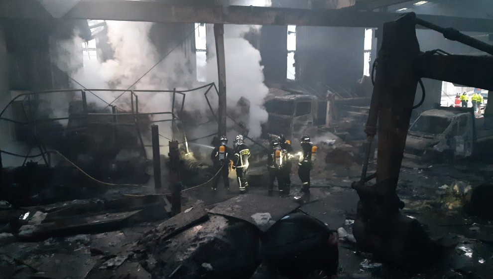 La nave principal, los vehículos y la maquinaria que contenía han quedado completamente afectados, y una nave anexa de dos alturas que albergaba las oficinas, presenta fundamentalmente daños en la planta de arriba.