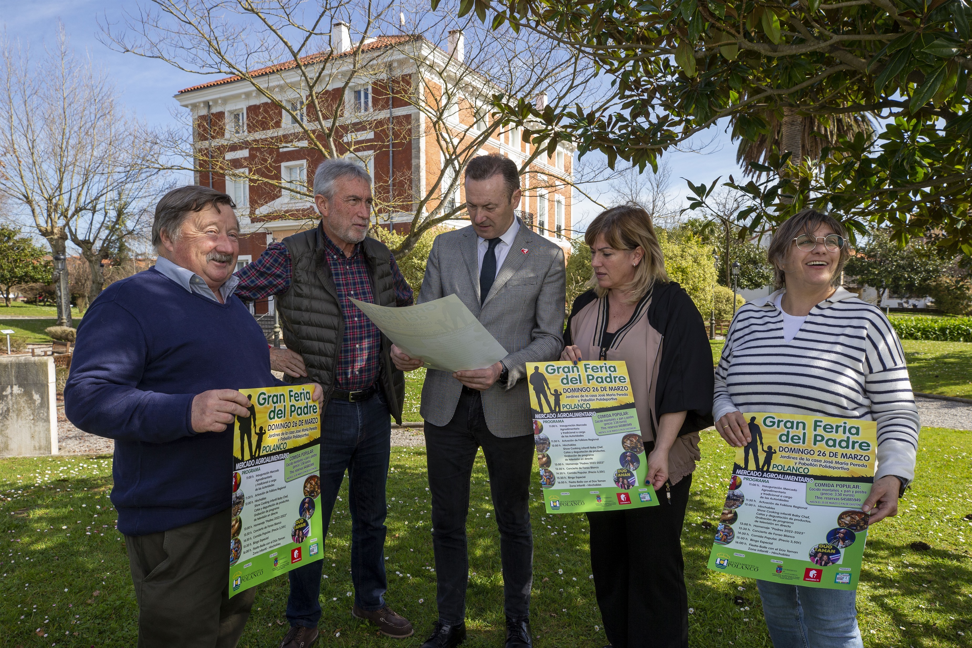 El consejero de Desarrollo Rural, Ganadería, Pesca, Alimentación y Medio Ambiente, Guillermo Blanco (centro), y la alcaldesa de Polanco, Rosa Díaz (segunda por la izda) en la presentación del cartel de la III Gran Feria del Padre del municipio