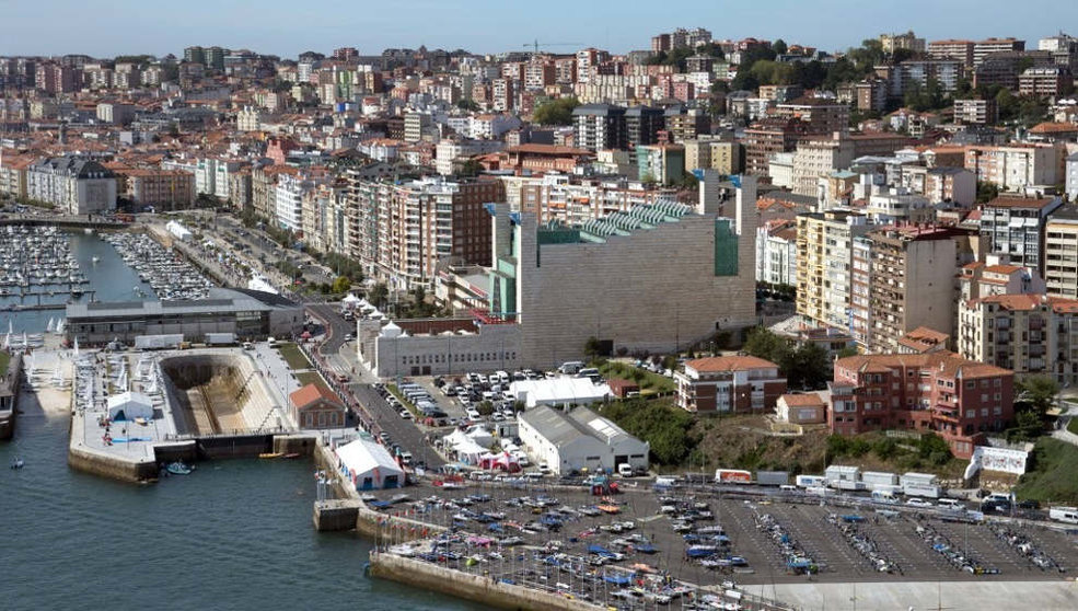 Vista aérea de Santander con el Palacio de Festivales en primer término