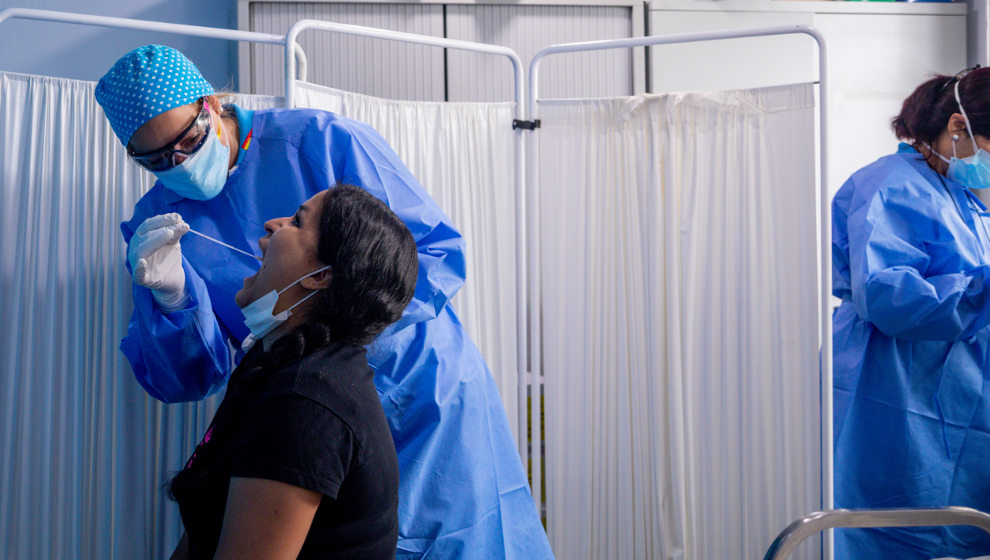 Un trabajador sanitario protegido le realiza a una mujer un test PCR