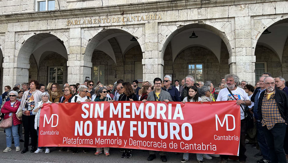 Un centenar de personas se ha concentrado este lunes frente al Parlamento de Cantabria para defender la Ley de Memoria Histórica y Democrática de la comunidad, que el actual Gobierno autonómico (PP) quiere derogar, sosteniendo una gran pancarta bajo el lema 'Sin memoria no hay futuro'.