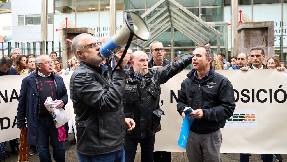 Un miembro del sindicato médico de Santander Óscar Ortiz (i) con un megáfono y otro miembro del sindicato médico Santiago Raba (d), durante la concentración de médicos de Atención Primaria