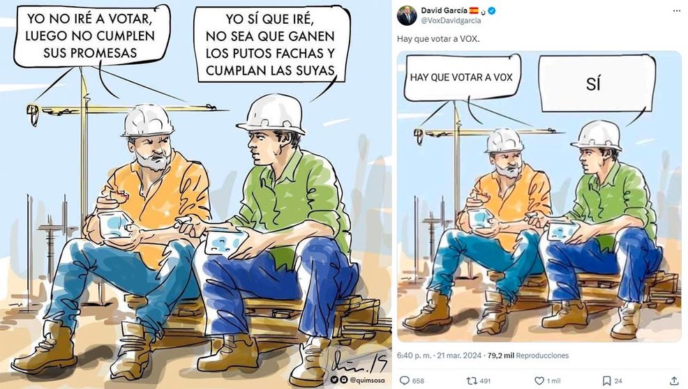 La manipulación del diputado de Vox, sin embargo, sitúa a estos dos obreros en la misma situación, pero el primero dice: “Hay que votar a Vox”, mientras que el segundo se limita a decir “Sí”. Así, la ultraderecha no solo utiliza sin permiso una viñeta, sino que elimina el mensaje contra el fascismo y la extrema derecha para darle la vuelta y pedir el voto precisamente para esa ultraderecha.