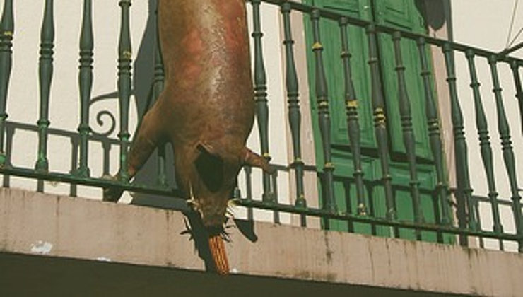 Cerdo muerto exhibido en la fachada de la Junta Vecinal de Otañes (municipio de Castro Urdiales) el 13 de diciembre de 2016