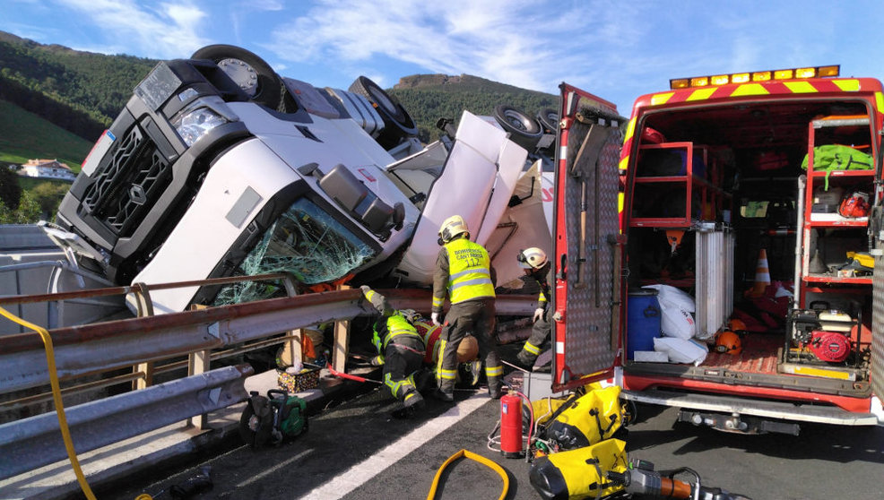 Fallece el conductor de un camión cisterna tras volcar en la A-8 a la altura de Ontón
