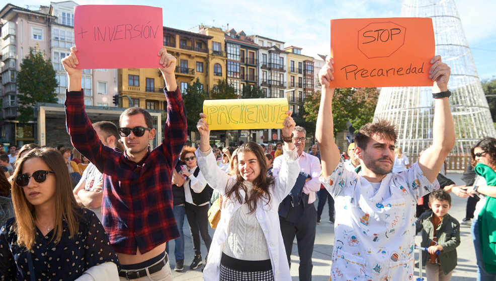 Numerosas personas portan pancartas de protesta durante una manifestación para apoyar la huelga prevista de la Atención Primaria en la Sanidad Pública y contra las agresiones a algunos sanitarios recibidas en centros de salud