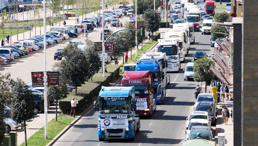 Varios camiones participan en una marcha convocada desde el polígono de Raos hasta el Centro Botín, durante el undécimo día de paro nacional de transportistas