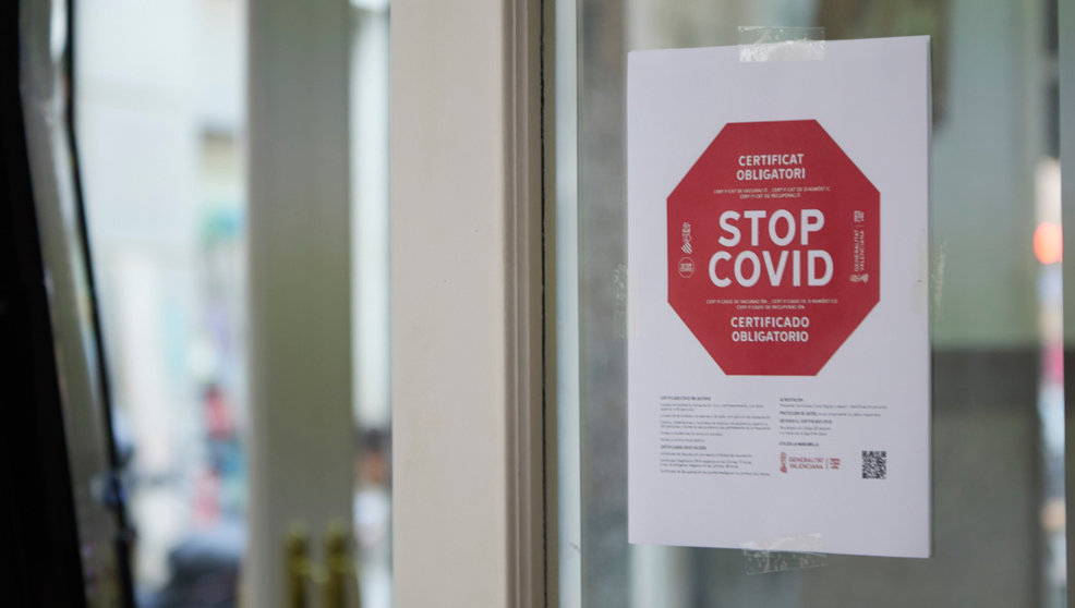 Cartel en la puerta de un bar durante el primer día de petición de Certificados Covid-19 para la hostelería