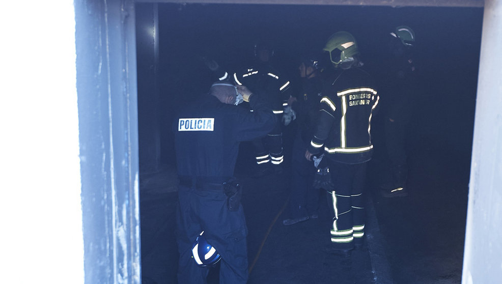Efectivos de la Policía Judicial de la Policía Nacional investigan el origen y causas del incendio declarado esta madrugada en un garaje comunitario de la calle José María Cossío, en la zona de Los Acebos, en el barrio El Alisal de Santander.
