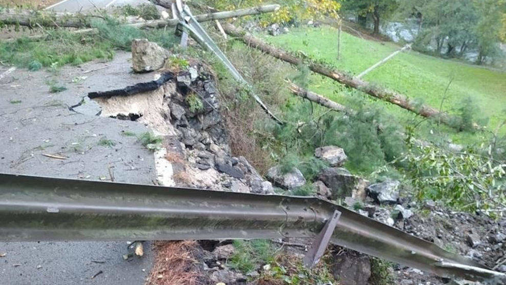Esta carretera autonómica ha quedado hundida y fracturada en algunos puntos, además de cortada por los árboles y ramas desprendidos en ella, aunque ya se ha podido habilitar un carril para permitir la circulación a los vecinos.