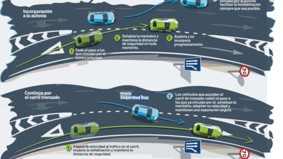 En el último número de la revista de la DGT, el organismo da las claves para circular de forma más segura. Así, si el conductor se incorpora a un trenzado actuará igual que en cualquier carril de aceleración convencional, progresivamente y respetando la señalización y la prioridad de los que ya circulan por ella: Observar la vía a la que accede lo antes posible, calcular la trayectoria y la distancia de los conductores en esa vía (ellos tienen prioridad), señalizar siempre la maniobra con el intermitente y realizar la incorporación progresiva, son pasos indispensables para realizar un correcto acceso a la vía. Además, indican que si tiene que detenerse para ceder el paso se debe hacer al principio del carril, y si circula por la vía principal cuando otro vehículo se incorpora, se debe facilitar la maniobra siempre que se pueda.