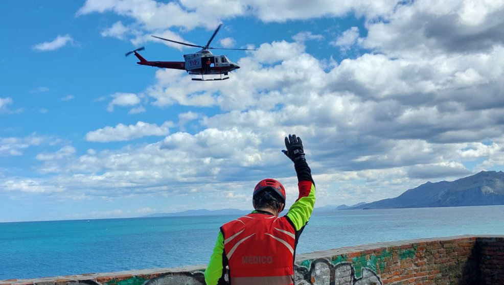 El rescatador y el médico de la aeronave han descendido a valorar al afectado. Al no encontrar nada grave, se le ha izado al helicóptero mediante operación de grúa con arnés de rescate para ser trasladado al aeropuerto Seve Ballesteros-Santander.