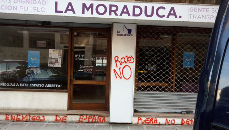 La sede de Podemos en Santander, ubicada en la calle Isaac Peral de la capital cántabra, ha amanecido este jueves con las pintadas ultraderechistas “rojos no” y “enemigos de España fuera, no dentro”. La secretaria general de Podemos Santander, Lydia Alegría, ha denunciado en su perfil de Twitter que “así amanece nuestra sede hoy. Frente al fomento del odio, nosotros seguiremos trabajando sin miedo”, junto a tres fotos de la fachada atacada. Alegría ha recibido el apoyo de diferentes personas, como el dirigente madrileño de Podemos Íñigo Errejón, que le ha contestado “ánimo! Raíces cada vez más profundas, construyendo pueblo”. El miembro del Consejo Ciudadano Autonómico de Podemos Cantabria Luis del Piñal también ha denunciado las pintadas en su perfil de Twitter. “Hoy en día defender el diálogo, la convivencia y la democracia tiene sus consecuencias. Que tengan claro que no nos pararán”, ha declarado.