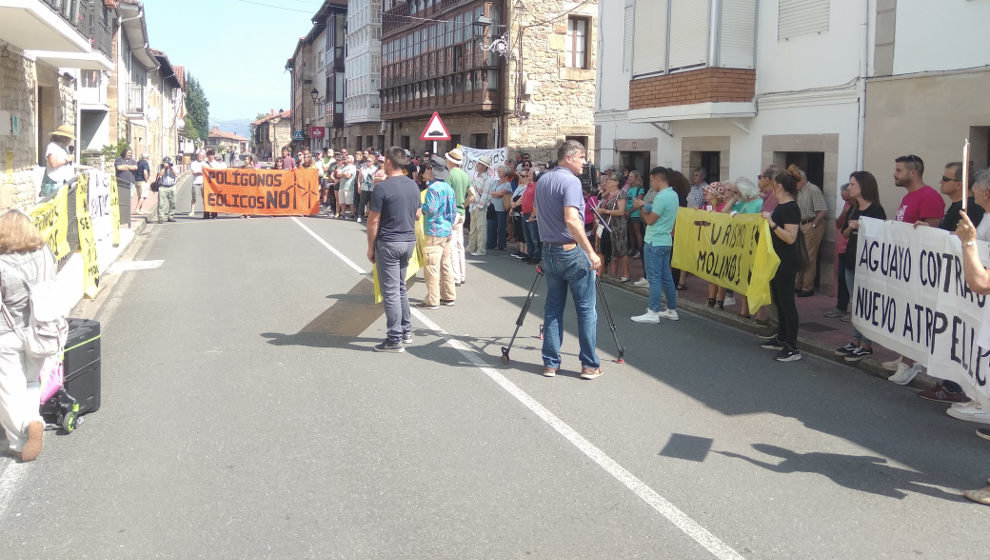 Los Colectivos Vecinales en Defensa del Territorio se han concentrado este martes frente al Ayuntamiento de Molledo para denunciar el "atropello" que están causando las obras del polígono eólico El Escudo, que denuncian que están "destrozando los humedales protegidos, los manantiales, los montes y las brañas" y las administraciones locales y regionales lo están "permitiendo".