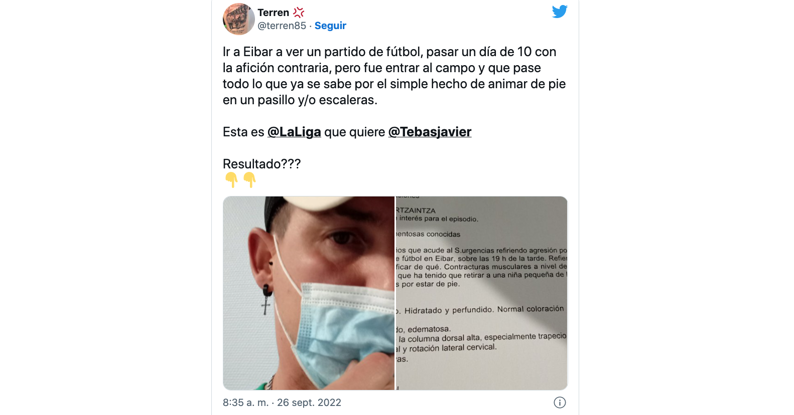 “Vergonzoso, lamentable, bochornoso y abusivo” son algunos de los adjetivos que se han sucedido tras ver las imágenes de las cargas policiales a los aficionados del Racing en la grada, que acusan de “cargar de manera indiscriminada” contra ellos. “Ir a Eibar a ver un partido de fútbol, pasar un día de 10 con la afición contraria, pero fue entrar al campo y que pase todo lo que ya se sabe por el simple hecho de animar de pie en un pasillo y/o escaleras”, denuncia un joven racinguista en sus redes sociales mostrando la lesión en su rostro así como el parte donde se puede leer la información médica: “lesión a nivel de pómulo izquierdo, dolor a la palpación en región de la columna dorsal alta, dolor en la flexoextension cervical y rotación cervical izquierda”. Además, se especifica que el sujeto “ha tenido que retirar a una niña pequeña de la grada ya que han comenzado a golpear a la gente con las porras por estar de pie”.