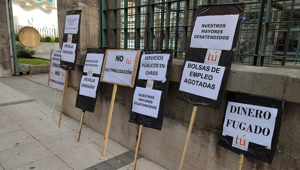 La protesta ha reunido a una veintena de trabajadores del sindicato que portaban pancartas en las que se leían reivindicaciones como 'privatización, precarización', 'nuestros mayores desatendidos', 'Revilla dimisión' o 'dinero fugado'.