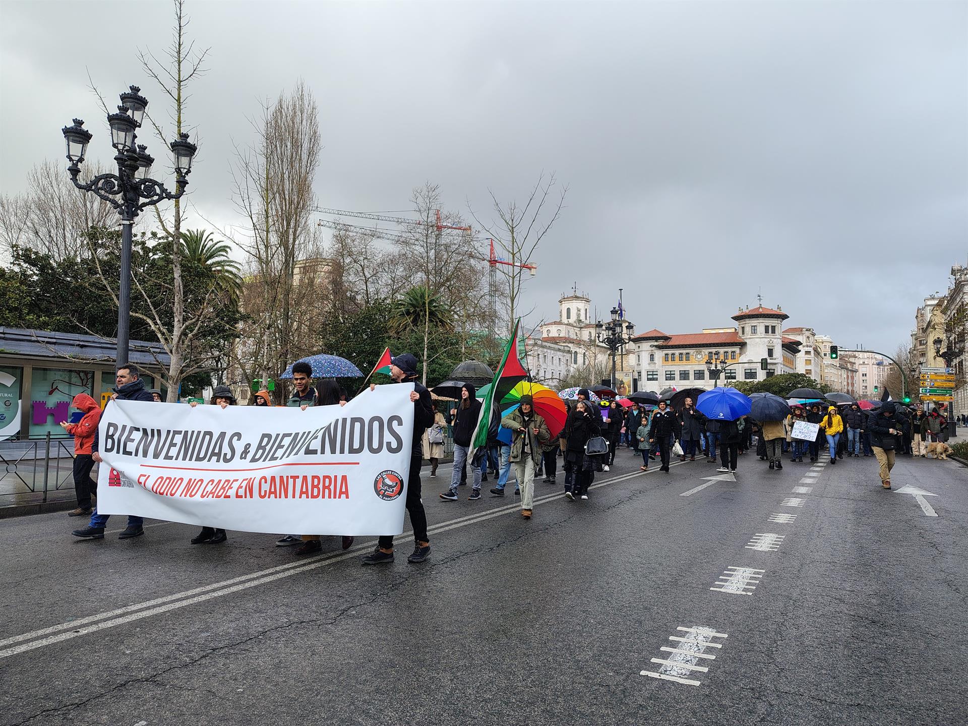 Así, los asistentes, que han desafiado a la lluvia y el viento, han dado respuesta a esta convocatoria lanzada por Pasaje Seguro y Calles contra el Fascismo que ha partido de la Delegación del Gobierno, en la calle Calvo Sotelo, para recorrer el Paseo Pereda y concluir en la sede del Ejecutivo cántabro en Peñaherbosa.