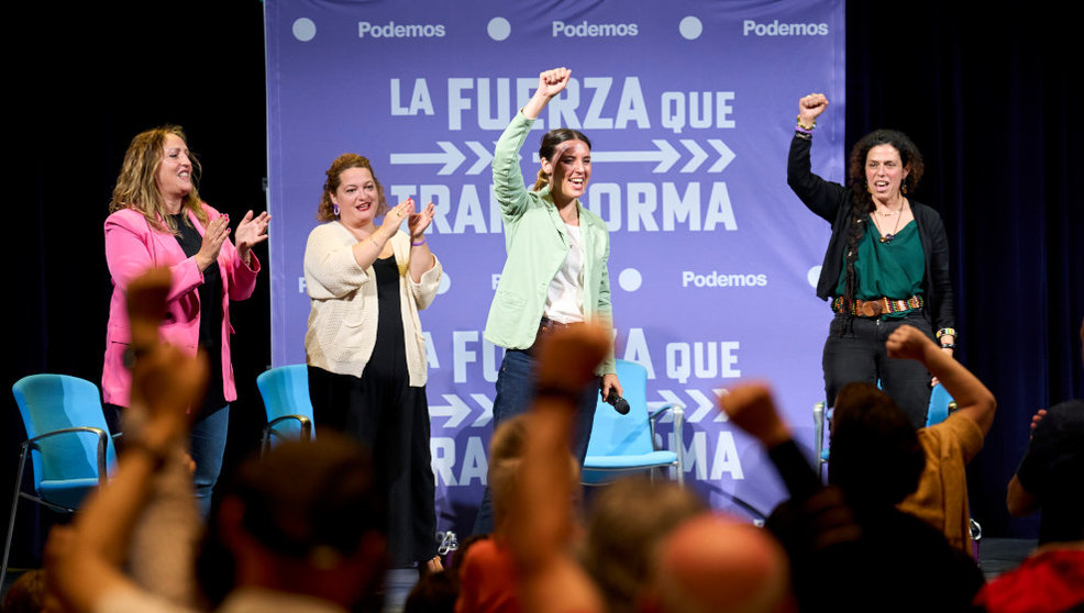 La ministra de Igualdad, Irene Montero, en un acto con las candidatas de Podemos-IU en Cantabria, Mónica Rodero y Carmen Martín, y con la coordinadora autonómica, Mercedes González