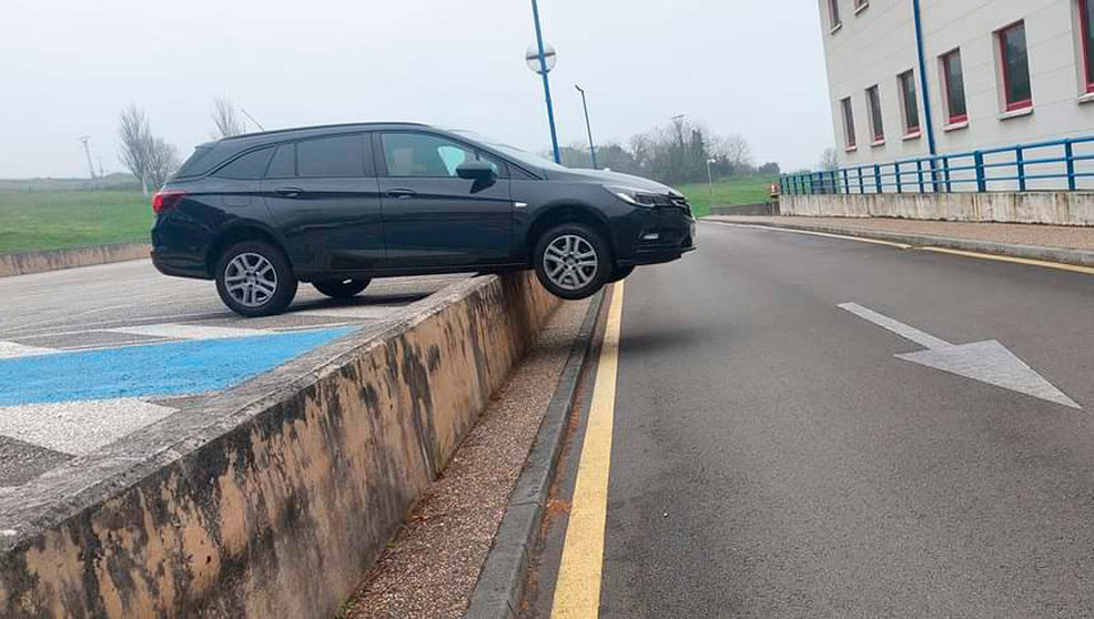 El Hospital de Liencres ha sido testigo de una situación cuanto menos curiosa que se ha conocido por redes sociales. Tal y como puede verse en la imagen que acompaña este texto, un vehículo ha quedado suspendido en el aire en el aparcamiento del centro sanitario, sobrepasando el muro que delimita la zona de aparcamiento.