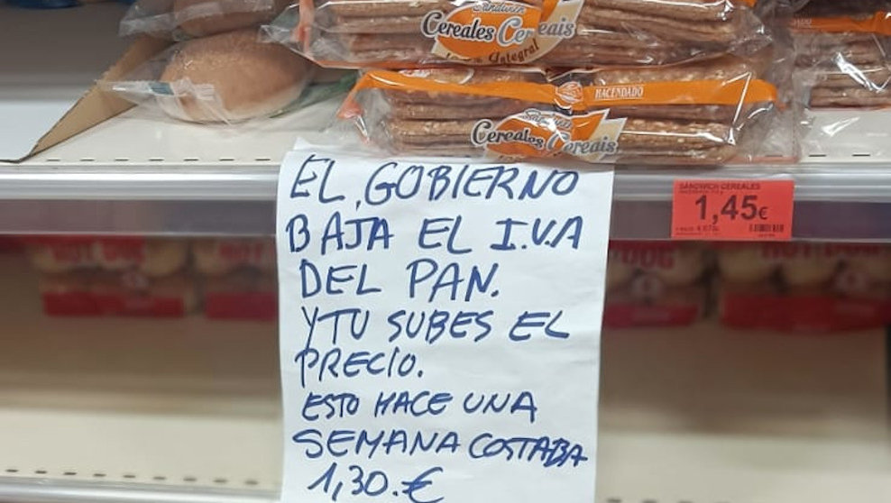 Un cliente, en su cuenta de Twitter (@Albertolopezc), ha publicado una fotografía en la que deja una nota en un Mercadona que dice lo siguiente: "El Gobierno baja el IVA del pan y tú subes el precio. Hace una semana costaba 1.30€ y tú lo subes a 1.45€".