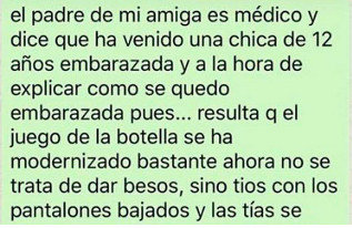 Dicha publicación es, en realidad, la captura de un mensaje de Whatsappdonde alguien explica el caso de una niña de 12 años que fue al médico después de haberse quedado embarazada, y cuando le preguntaron como había pasado, explicó que estaba jugando a una nueva versión del ‘juego de la botella’ en la que ya no hay ninguna botella.