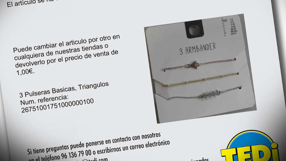 La cadena de bazares de origen alemán Tedi, con presencia en la mayor parte del territorio español, ha retirado del mercado un juego de pulseras (3 pulseras básicas, Triangulos) por mostrar altos níveles de cadmio.