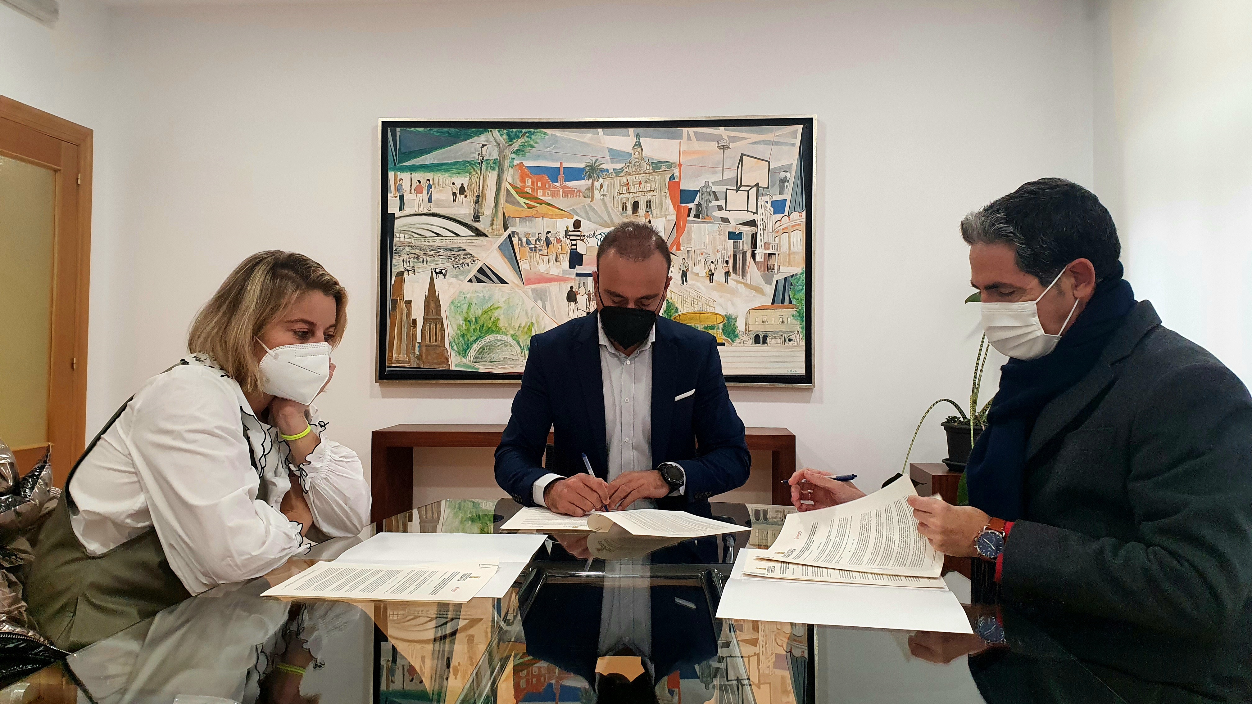 El alcalde, Javier López Estrada; la concejala de Comercio, Cristina García Viñas; y el presidente de la Cámara de Comercio de Torrelavega, Carlos Augusto Carrasco, firman la colaboración entre Ayuntamiento y entidad cameral