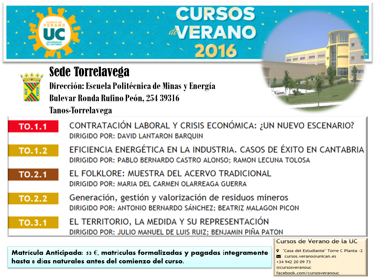 - Del 22 al 24 de junio tendrá lugar el curso “Eficiencia energética en la industria. Casos de éxito en Cantabria”, dirigido por dos profesores e investigadores de la UC, Pablo Bernardo Castro Alonso y Ramon Lecuna Tolosa. El curso incluye una visita técnica a una empresa de la comarca del Besaya como parte práctica del curso.