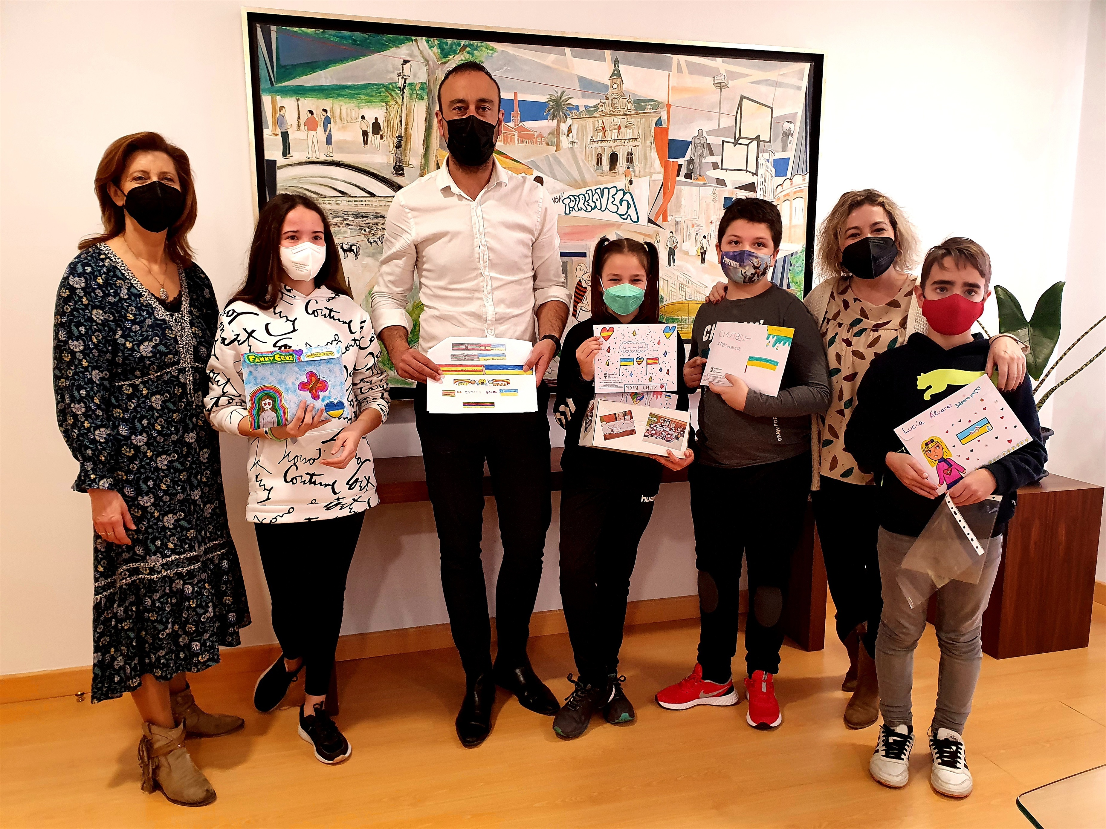 Varios profesores y alumnos de 5º y 6º de Primaria del colegio Fernando de los Ríos de Torrelavega se han reunido este viernes con el alcalde, Javier López Estrada, para trasladarle las diferentes iniciativas que se están llevando a cabo en el centro con motivo de la guerra en Ucrania.