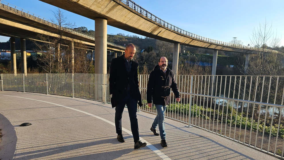 El alcalde, Javier López Estrada, y el concejal de Obras, José Luis Urraca, en la nueva rampa que une la pasarela sobre el Saja-Besaya con el parque de Las Tablas