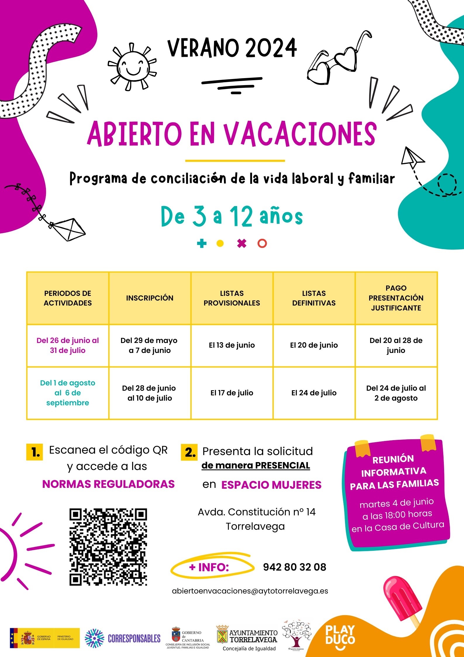 La lista provisional de admitidos se publicará el 17 de julio. Las normas y hoja de inscripción de acceso se publicarán en el tablón de anuncios y página web de Espacio Mujeres www.espaciomujerestorrelavega.es y del Ayuntamiento de Torrelavega www.torrelavega.es.