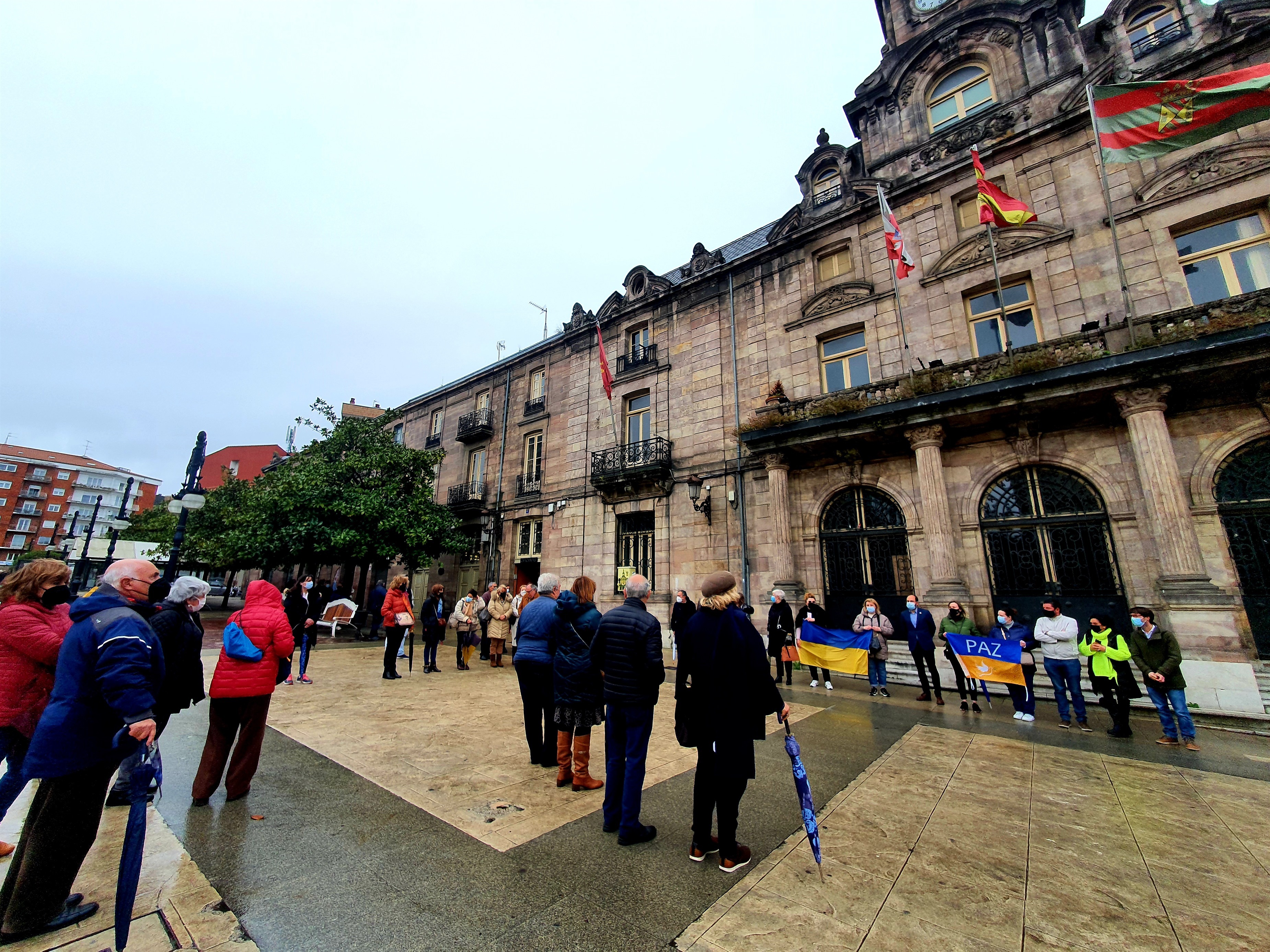 Decenas de personas han participado este miércoles en la concentración silenciosa llevada a cabo en Torrelavega, sumándose a la convocatoria en ayuntamientos de toda España impulsada por la Federación Española de Municipios y Provincias (FEMP) para trasladar apoyo y afecto a los afectados por el conflicto bélico en Ucrania.